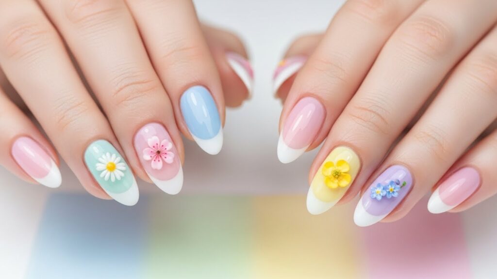 Each nail has a different pastel color at the tip. Soft pink, mint, lavender, yellow, and sky blue look amazing.