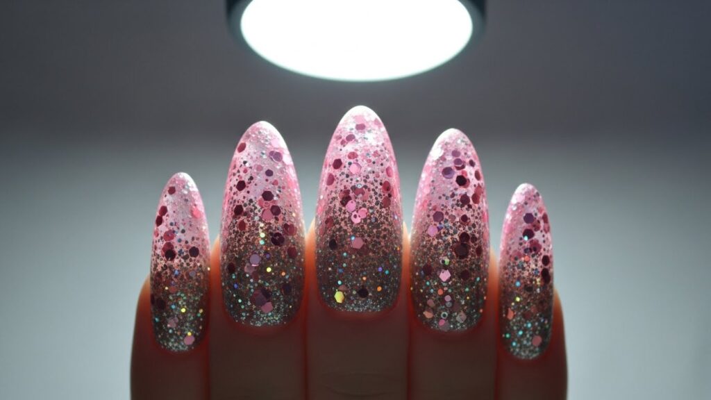 Long nails with sparkly pink glitter give a magical, fairy-tale vibe.