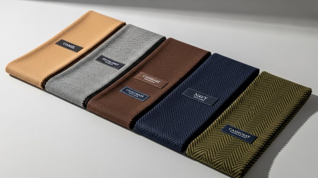 → Camel, charcoal grey, forest green, deep navy, and matte black